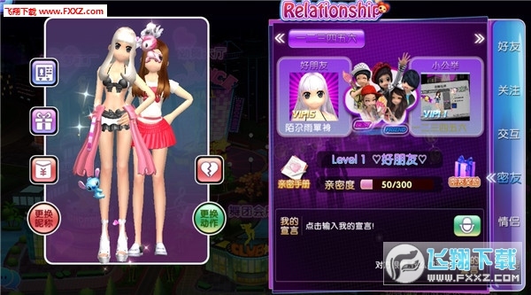 成为好友后,可以通过提升友好度进阶成为密友!成为密友后,除了能更改对方的专属昵称,还能设置专属动作!同时,还可以领取神秘的密友奖励!提升密友等级后,还能解锁专属合成服装!