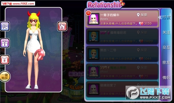 在社交界面,你可以查看到自己的好友、密友及情侣,此外还能通过交互回顾曾经擦肩而过的玩家。只有互相关注,才能成为好友哦,否则只能单相思啦!你可以查看对方的名片信息,送礼物、红包,甚至直接购买对方身上的服饰。
